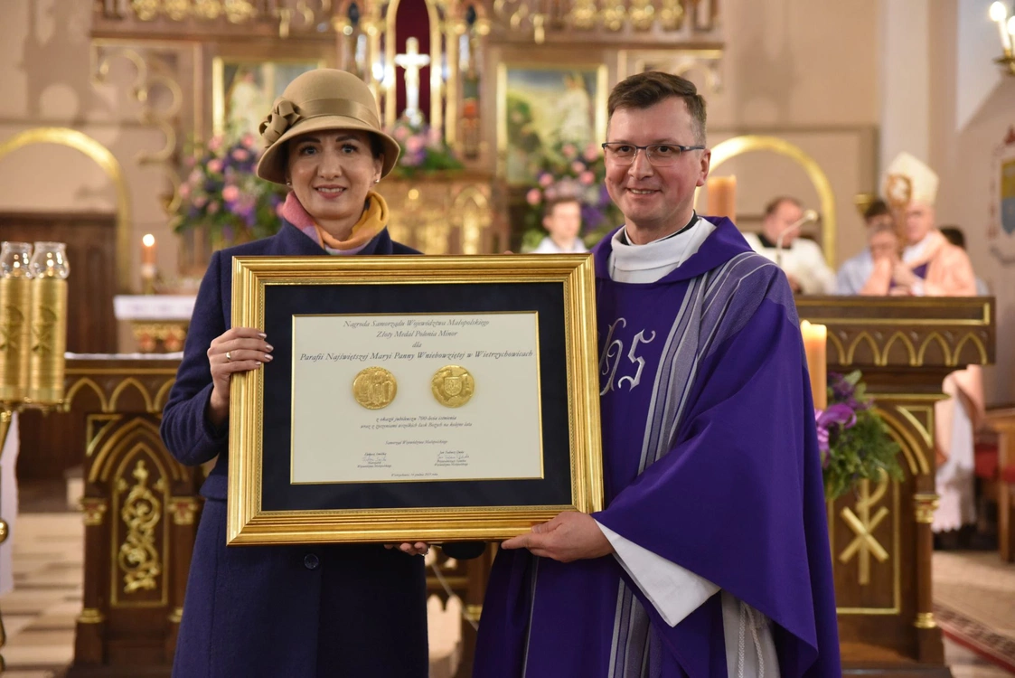 Niespodzianką dla parafii, po zakończeniu Mszy św., było ogłoszenie przyznania jej złotego medalu Polonia Minor, najwyższego wyróżnienia województwa małopolskiego. Medal wręczyła ks. Walczykowi Marta Malec-Lech - członek zarządu województwa małopolskiego.