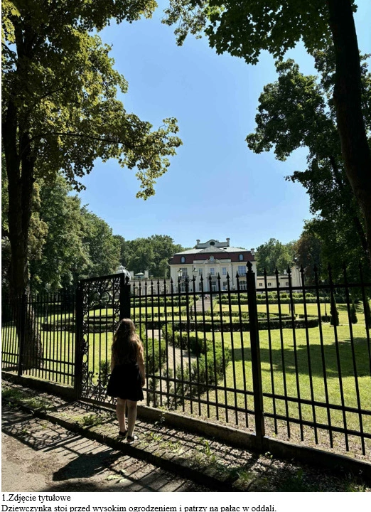 Dziewczynka, która codziennie zza ogrodzenia patrzyła na piękny pałac, w końcu trafiła na okazję, żeby choć na chwilę spełnić swoje marzenie. Pewnego dnia wydarzyło się bowiem coś niespodziewanego, pałacowe wrota były lekko uchylone. Alina rozejrzała się wokół i ,nie widząc przeszkód, skorzystała z możliwości wejścia do środka. Przez chwilę zatrzymała się, jakby nie mogła uwierzyć w to, że znajduje się po drugiej stronie. Nagle na jej twarzy pojawiła się wielka radość. W końcu znalazła się w miejscu, o którym marzyła. Spacerowała po ogrodzie i zachwycała się jego pięknem. Wysokie drzewa kołysały się lekko na wietrze. Między nimi wiła się wąska ścieżka prowadząca do pałacu. Z bliska to wyglądało niesamowicie. Czuła, że przeżywa coś wyjątkowego.
