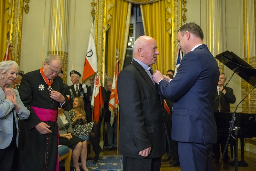 Prezydent Andrzej Duda wręczył odznaczenie ks. Stanisławowi Jeżowi w polskiej ambasadzie we Francji 28 X 2015