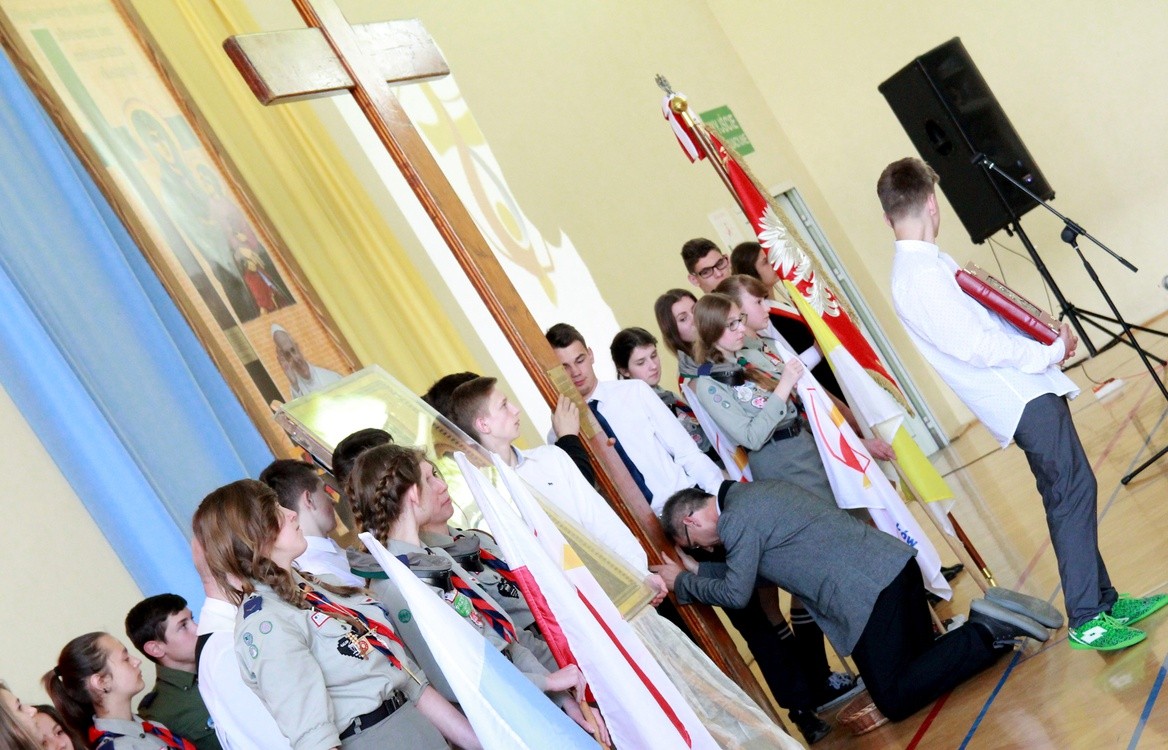 Uczniowie z Zespołu szkół w Szymbarku, dzieci i młodzież, adorowali krzyż i ikonę "Salus ​Populi Romani" w czasie ich peregrynacji po dekanacie ropskim.