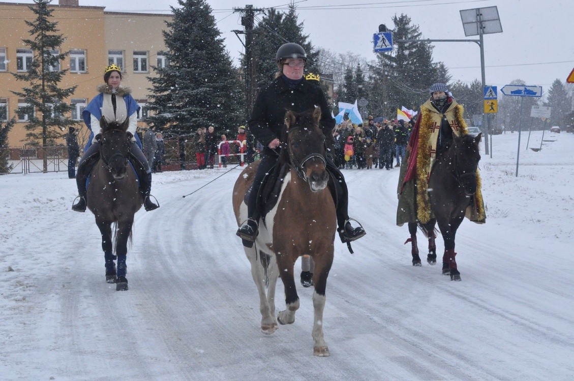 Orszak Trzech Króli wyruszył sprzed szkoły podstawowej. Hołd Jezusowi odbył się na schodach kościoła parafialnego.