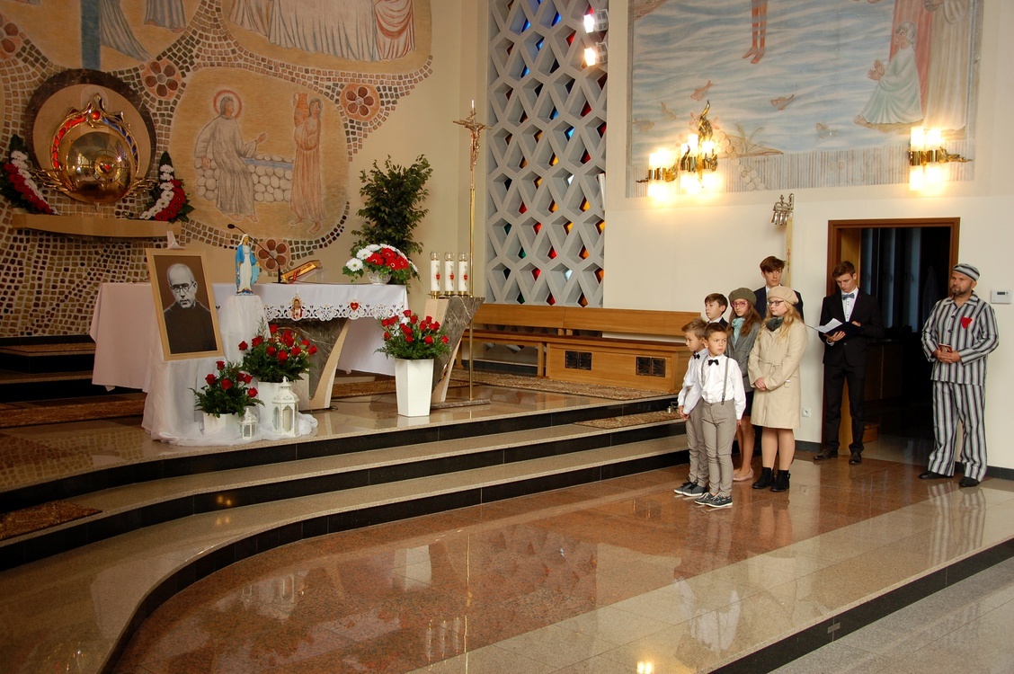 Grupa dzieci, młodzieży i dorosłych przedstawiła życie św. Maksymiliana, a uczestnicy spotkania ze świętym w znaku relikwii mogli oddać im cześć.