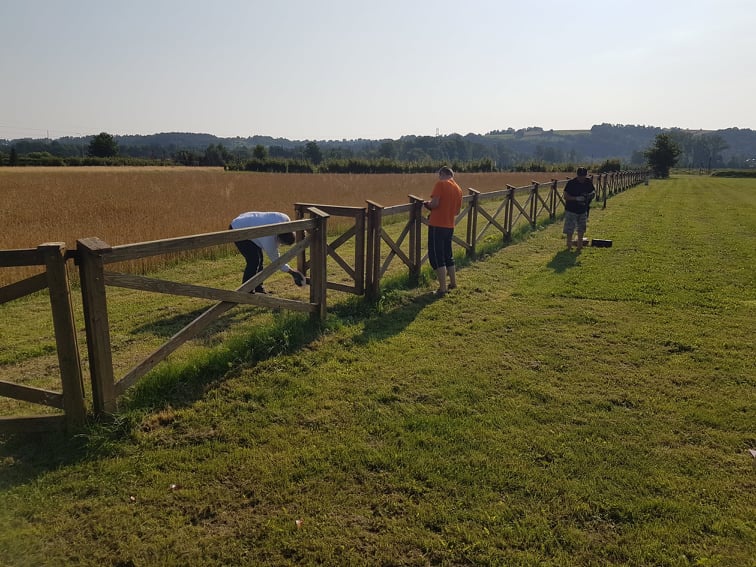 24 lipca, sobotni ranek i godziny południowe, Bracia Rycerze św. Jana Pawła II z komandorii tarnowskiej poświęcili na pracę przy odnowieniu i konserwacji ogrodzenia przy Diecezjalnym Centrum Pielgrzymowania św. Jana Pawła Ii w Starym Sączu.