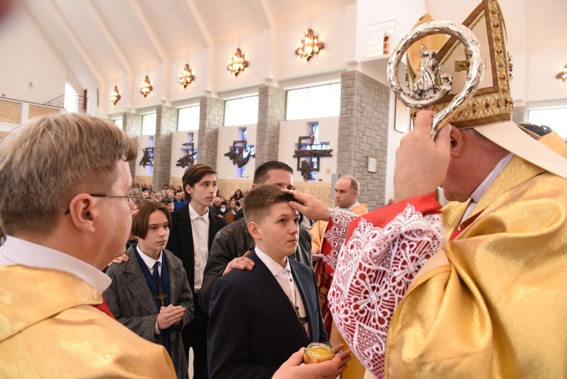 W kościele parafialnym bp Andrzej Jeż bierzmował młodych z Męciny i Pisarzowej.