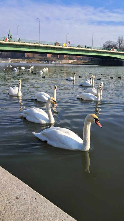 Pewnego dnia mały ptaszek zobaczył piękny widok. Wschodzące słońce zabarwiło chmury na różowo, w tafli wody odbijały się ciepłe promienie słońca, które obudziły ptaszka. Wzleciał on w niebo i zobaczył piękne łabędzie płynące w górę rzeki.